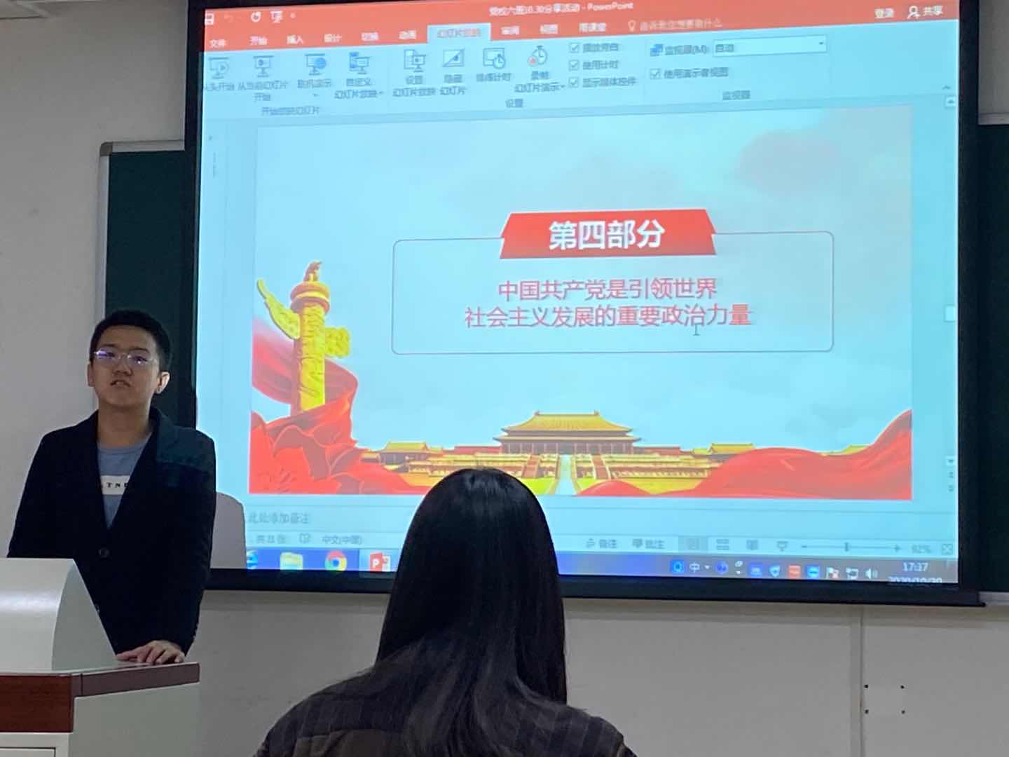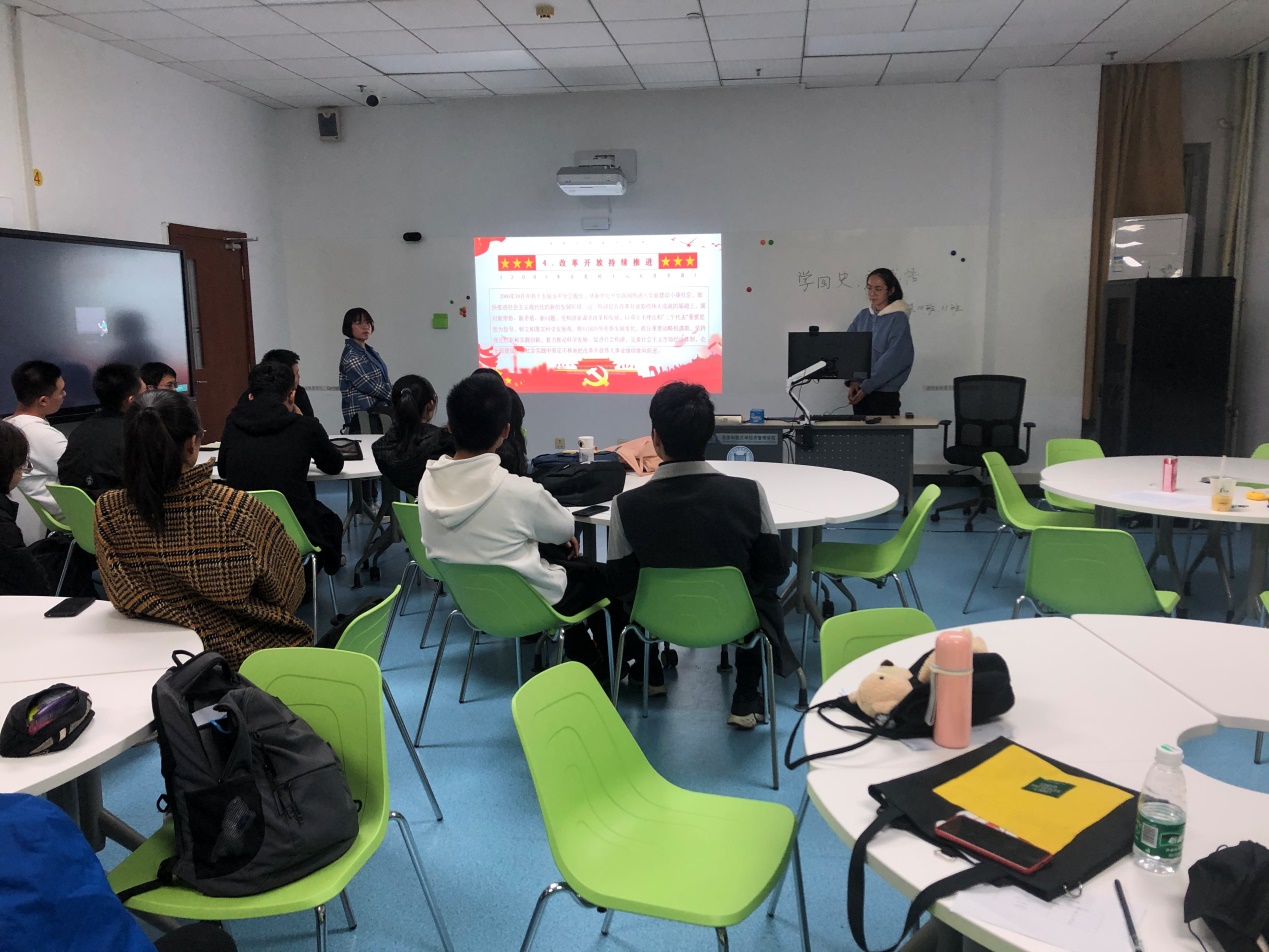 在小班主任白一鸣的带领下,党校一班全体10名成员分别分享自己对“党史、新中国史、改革开放史、社会主义发展史”的深层次认知。在分享过程中,台下的学员对主要内容进行记录和记忆。汇报结束后小班主任针对刚刚分享的内容进行简单回顾与提问引导,学员们根据自己的理解一一回答,颇有成效。