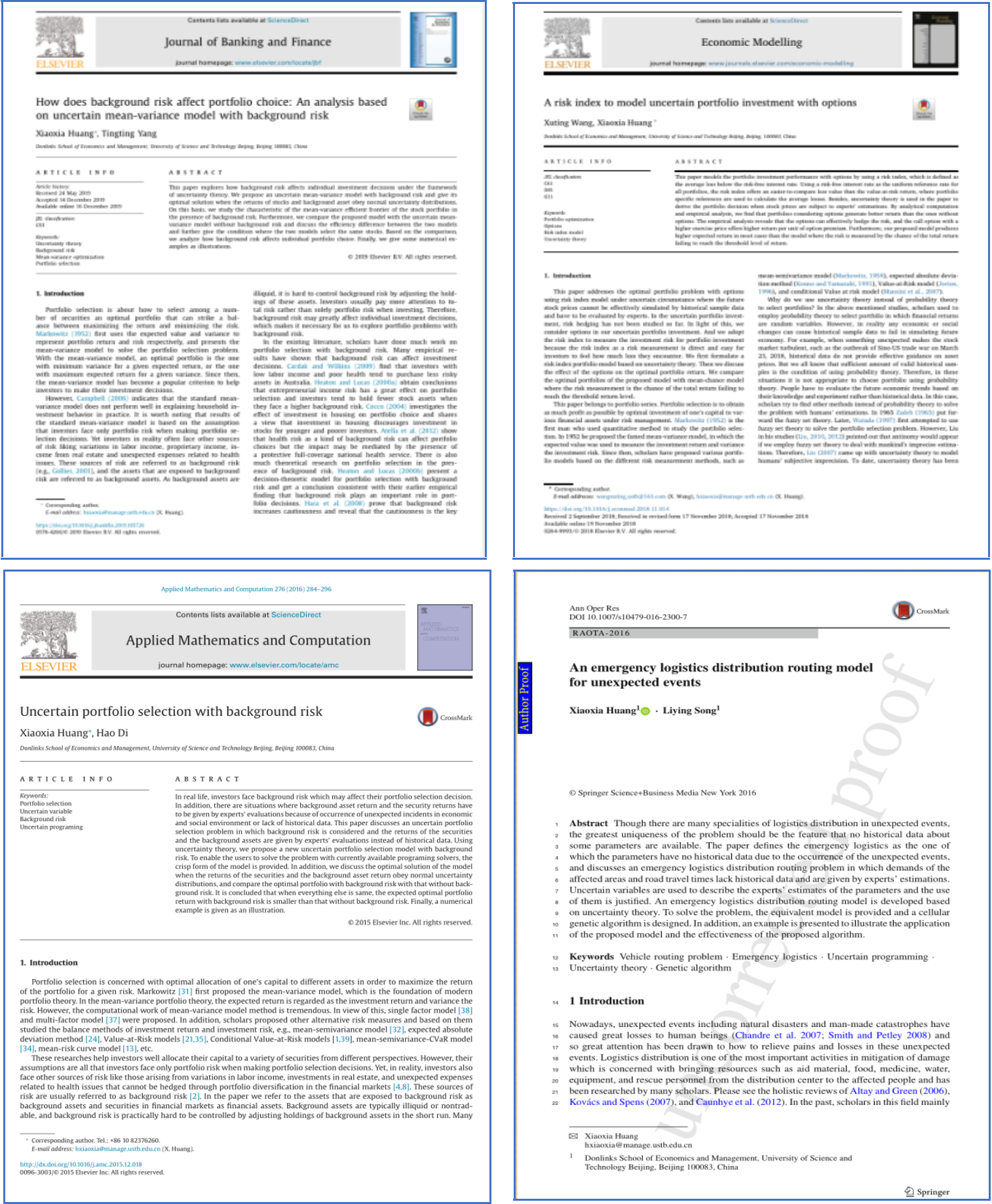 黄晓霞教授是一位有良好的思想作风、敬业勤奋、热爱研究生教育的优秀教师,获得过学校“研究生论文指导优秀奖”、“优秀共产党员”和“十大新闻人物”等荣誉。黄晓霞教授致力于投资优化、项目选择、优化与决策分析方面的研究,已有四十篇论文被SCI、SSCI检索的国际著名期刊发表,主持过多项国家级科研项目,是“教育部新世纪优秀人才”,其研究专著获北京市第十二届哲学社会科学优秀成果一等奖,学术研究处于学科前沿。