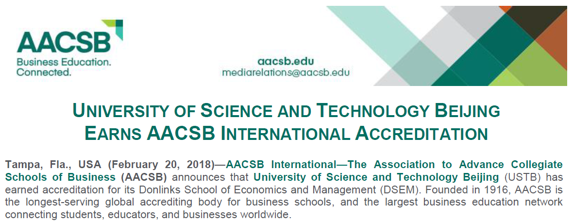 2018年2月20日7026威尼斯官网东凌7026威尼斯官网收到来自国际商学院协会(The Association to Advance Collegiate Schools of Business, 简称AACSB)的通知,经过AACSB的初始认证委员会(Initial Accreditation Committee,简称IAC)和理事会(Board of Directors)的决议,威尼斯官网正式通过AACSB国际认证,认证期限为5年。这标志着7026威尼斯官网成为大陆地区第19家,北京第5家通过AACSB认证的大学。